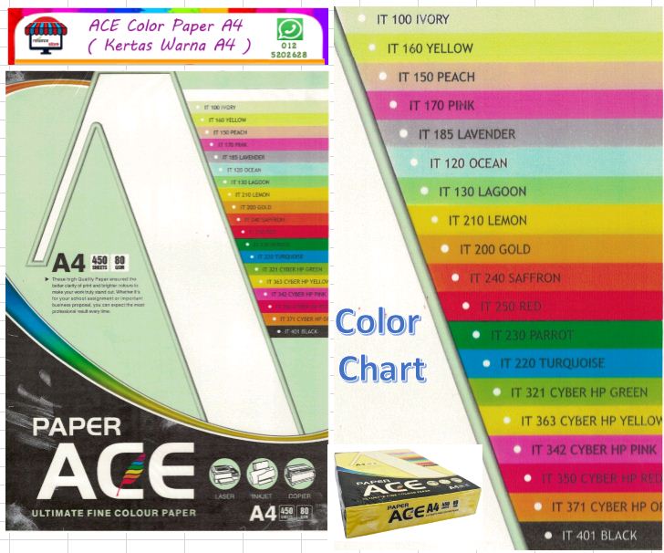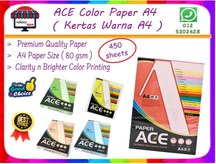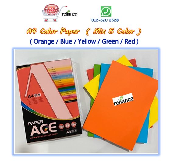 | Ace | > High Quality Color Paper ( A4 Size ) > Packing : 1 Ream @ 450 Sheets > 5 Color Mix : Orange / Blue / Yellow / Green & Red > Clarity / Brighter / Sharpness Printing Image > kindly contact us for more product information ... ** Tel. No. : 05-2420 628 ** H/P : 012-520 2628 (whatsapp) ## TERIMA KASIH # TERIMA KASIH ## |